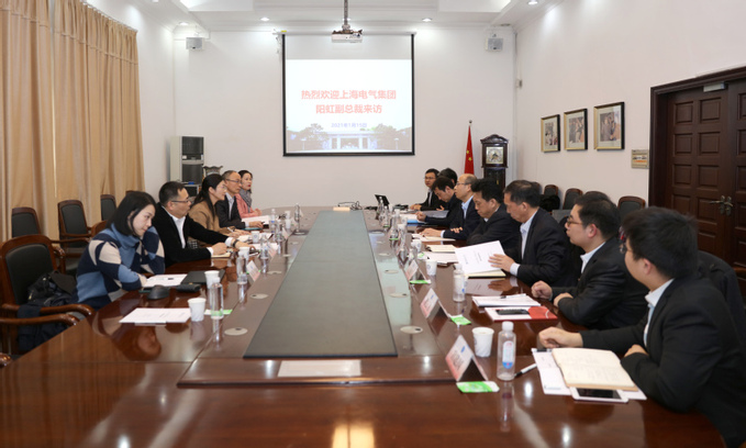 1月15日,上海电气集团副总裁阳虹一行来访威尼斯官网,校长轩福贞会见来宾。座谈会由科研院院长朱为宏主持。